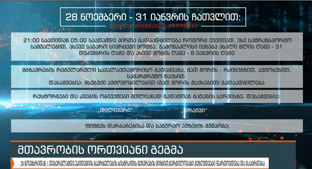 უწყებათაშორისმა საკოორდინაციო საბჭომ წერტილოვანი შეზღუდვების გამკაცრებასთან დაკავშირებით გადაწყვეტილება მიიღო. შეზღუდვების გეგმა ორთვიანია. 28 ნოემბრიდან დაიწყება და პირველ თებერვლამდე გაგრძელდება. რაც შეეხება შეზღუდვებს 28 ნოემბერიდან - 31 იანვრის ჩათვლით: ქვეყნის მასშტაბით იზღუდება: