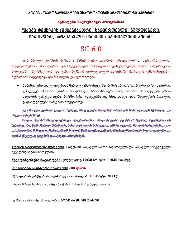 “მძიმე ტექნიკის (ექსკავატორი, სატვირთველი, ბულდოზერი, გრეიდერი, სატკეპნელი) მართვის სპეციალური კურსი“ SC 6.0